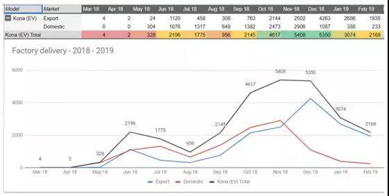 讓人意外的是,在消費(fèi)市場(chǎng)預(yù)期很好的情況下,隨著銷量的不斷上漲以及市場(chǎng)的不斷擴(kuò)大,科納的產(chǎn)量卻在不斷的下降。1月份僅生產(chǎn)了3074輛,到了2月份科納產(chǎn)量降至2168輛,較1月產(chǎn)量下降近三分之一。