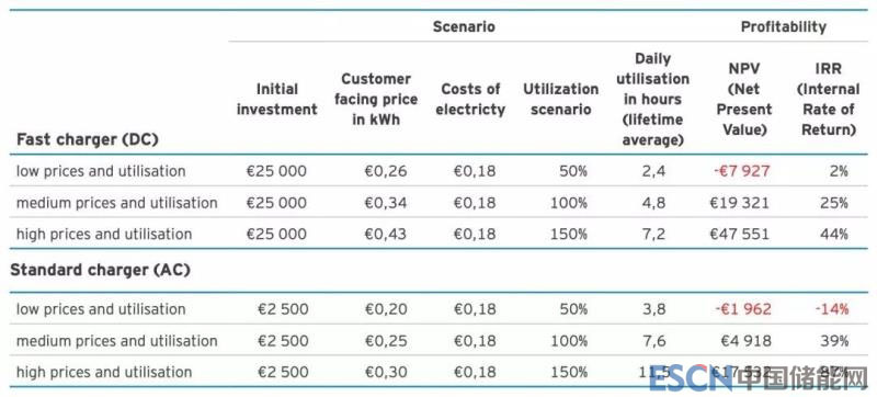 如果是普通交流充電樁,初始投資僅為2500歐元,電價(jià)0.18歐元/千瓦時(shí),此時(shí)只要客戶充電價(jià)格在0.25歐元/千瓦時(shí),充電樁平均每天利用時(shí)間7.6小時(shí),那么內(nèi)部收益率就可以達(dá)到39%。如果充電費(fèi)用低至0.20歐元/千瓦時(shí),充電樁平均每天利用時(shí)間減半至3.8小時(shí),那么就是虧本買賣,收益凈現(xiàn)值和內(nèi)部收益率均為負(fù)數(shù)。