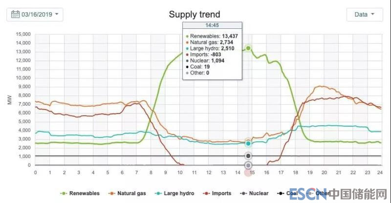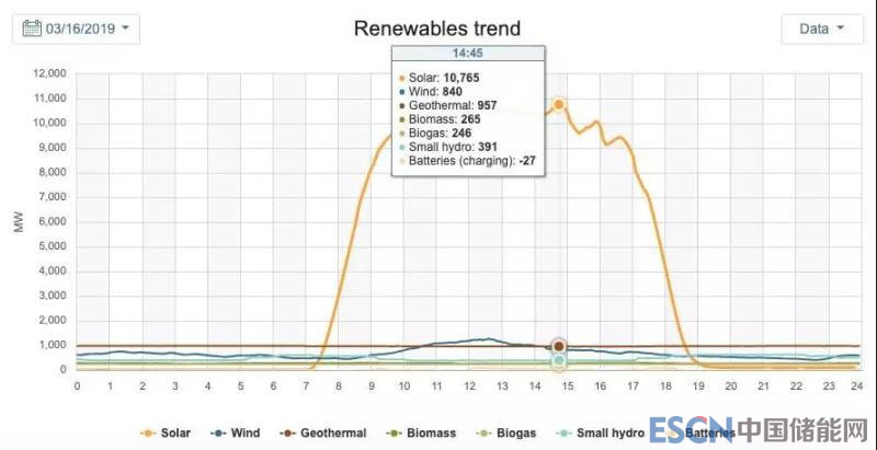 來自加利福尼亞獨立系統(tǒng)運營商(CAISO)的數(shù)據(jù)顯示,3月16日加利福尼亞公共事業(yè)級光伏出力在當(dāng)?shù)貢r間下午2:45左右達(dá)到10,765兆瓦,這是自2018年6月加利福尼亞光伏創(chuàng)下10,740兆瓦之后的最高水平。如果考慮風(fēng)電、地?zé)?、水電、生物質(zhì)、沼氣等電源,那一時刻的可再生能源出力達(dá)到13,437吉瓦。