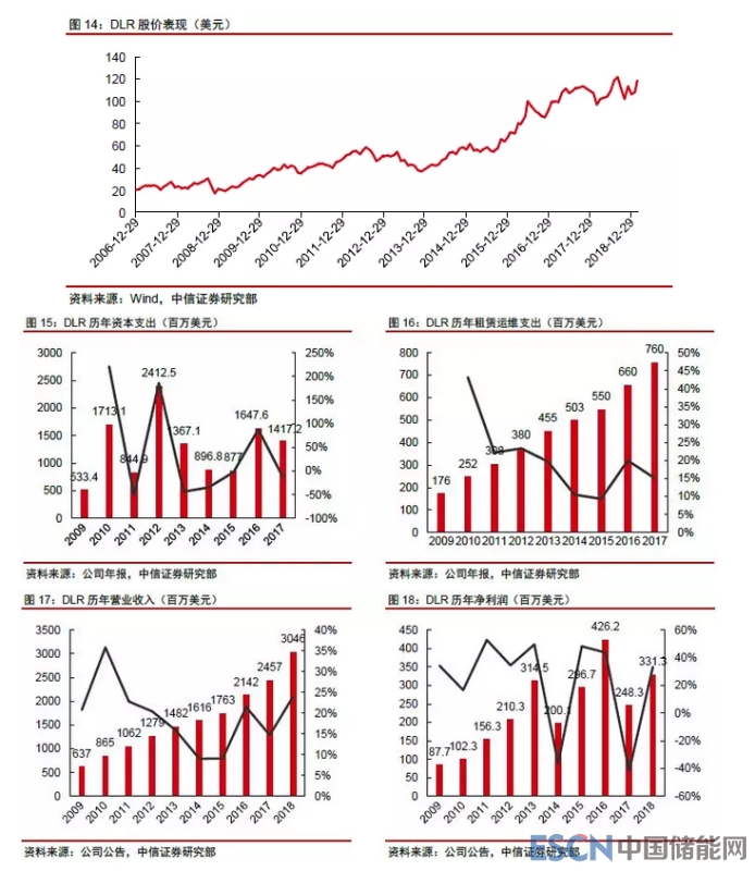 案例:DigitalRealtyTrust,全球最大批發(fā)型數(shù)據(jù)中心。Digital Realty Trust(數(shù)字房地產(chǎn)信托公司,簡稱DLR)2004年上市時擁有23座數(shù)據(jù)中心,占地52萬平方米。自2004年上市以來,DLR派息額逐年增加,曾經(jīng)入選全球Top 20 Dividend Stocks。借助REITs化帶來的融資能力,DLR目前在全球擁有214座數(shù)據(jù)中心,近三年的營業(yè)收入為21.4/24.6/30.4億美元,(+21.5%/14.7%/24%),近三年凈利潤為4.3/2.5/3.3億美元(+43.7%/-41.8%/33.4%)。