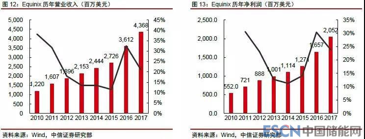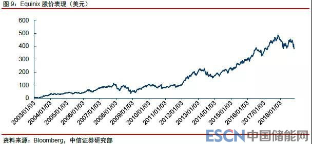 案例:Equinix,內(nèi)生+外延業(yè)務模式受益于REITs化。Equinix在2012年宣布向REITs轉(zhuǎn)變,于2015年正式成為房地產(chǎn)企業(yè)。轉(zhuǎn)型REITs后,公司經(jīng)營杠桿大幅提升,并推動業(yè)務快速增長,市值至今上漲216%。公司轉(zhuǎn)型后三年資本支出為8.7/11.1/17.7億美元(+28%/28%/59%),收購支出為2.5/17.7/39.6億美元(2013/14年為0.5/0億美元)。得益于REITs化,Equinix轉(zhuǎn)型后三年的收入平均增速為22%(轉(zhuǎn)型前三年為15%),EBITDA平均增速為23%(轉(zhuǎn)型前三年為16%)。Equinix的數(shù)據(jù)中心數(shù)量從2015年的115個上升至2018Q3的183個,2019年Equinix還計劃新建設(shè)24個數(shù)據(jù)中心,并計劃收購若干家知名IDC廠商的資產(chǎn)。