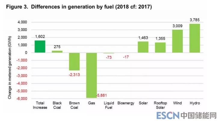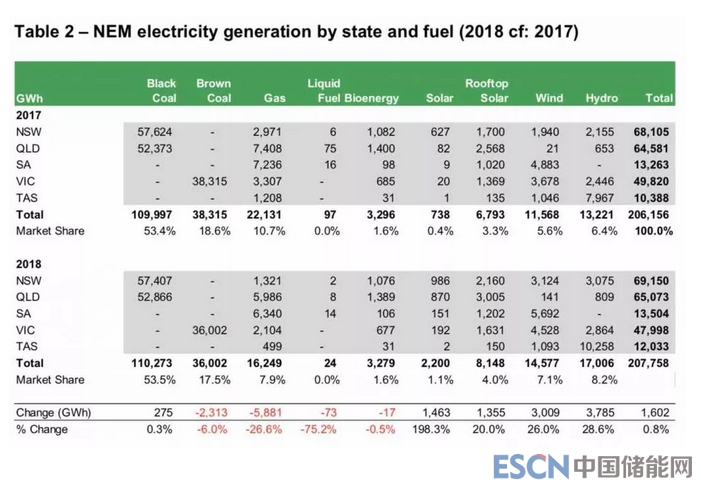 中國儲能網(wǎng)訊:2018年澳大利亞發(fā)電量為2077.58億千瓦時,其中煤電71.0%、天然氣7.9%、水電8.2%、風(fēng)電7.1%、光伏5.1%(屋頂光伏4.0%)、生物質(zhì)1.6%。雖然化石能源仍接近80%,但是發(fā)電量已經(jīng)比2017年明顯下降,而光伏、風(fēng)電、水電快速增長。