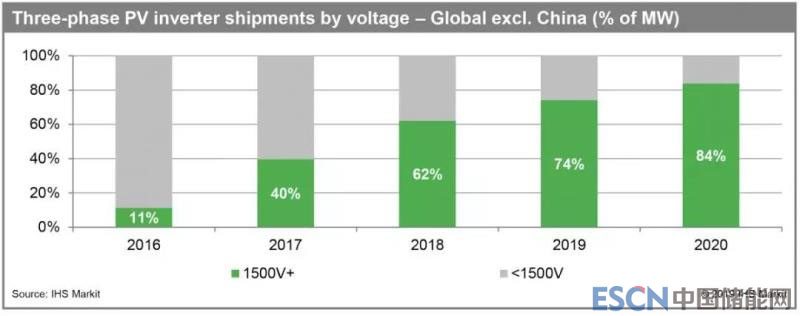 伴隨1500V系統(tǒng)在全球光伏市場的攀升,1500V逆變器出貨量借勢“水漲船高”。IHS報告顯示,在2017年除中國外的全球光伏市場上,三相逆變器出貨中的40%為1500V,2018年這一比例已提升至62%,全面超越1000V。IHS預(yù)計,2019年1500V三相逆變器份額將繼續(xù)增至74%,2020年則飆升到84%。