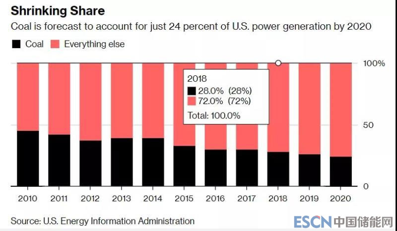 中國儲能網(wǎng)訊:根據(jù)彭博社轉(zhuǎn)引美國能源信息署的數(shù)據(jù),2010年美國煤電比例為45%,此后逐年下降。2017年煤電比例為30%,2018年進一步下跌至28%。2018年美國有18座煤電廠退役,創(chuàng)造歷史上煤電退役的最高水平;預計2019年仍將有14座煤電廠退役。美國能源信息署預測,2020年美國煤電比例僅剩24%。