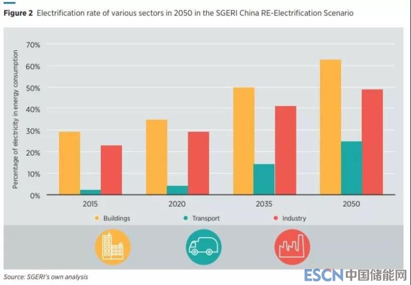 在中國,國家電網(wǎng)能源研究所(SGERI)的研究表明,中國最終能源使用總量中的電力份額可能會從目前的21%增長到2050年的47%。2015年至2050年能源使用總量將增加約30%,而電力消耗將增長140%。同時中國電力供應(yīng)將發(fā)生結(jié)構(gòu)性的改變,到2050年可再生能源將提供66%的發(fā)電(太陽能光伏和風力發(fā)電占41%)。建筑物的再電氣化可能性特別高,預(yù)計到2050年電力在建筑能源消耗中的份額將從目前的29%增加到63%;工業(yè)和運輸部門能耗的電力份額將分別達到49%和25%。