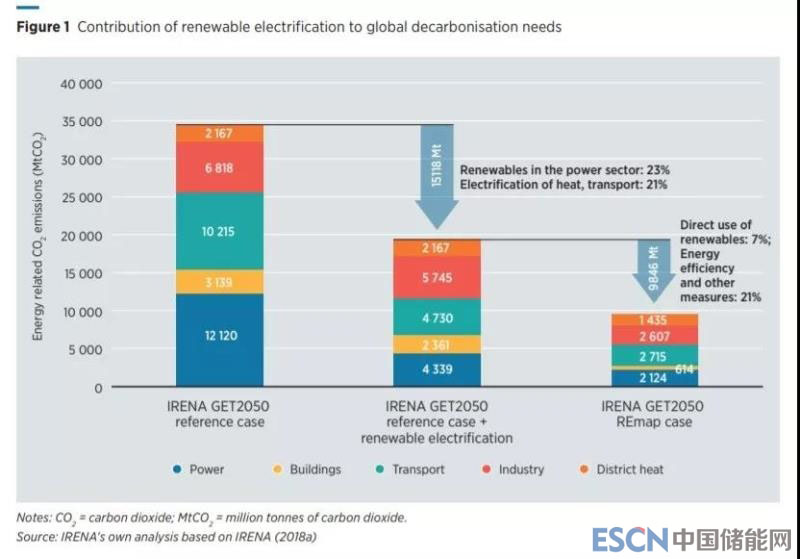 雖然電力消費在增加,但是減少了總能量需求,如電氣化的供熱和運輸系統(tǒng)的效率高于化石燃料。IRENA認為全球范圍內(nèi)建筑物用能電氣化的潛力最高(2050年可達50-80%),其次是工業(yè)部門(34-52%),然后是運輸部門(10-52%)。IRENA預(yù)測,2050年全球可以使用十億輛電動汽車,使用熱泵的供暖的建筑物可能會增加十倍,數(shù)量可能超過2.5億臺。