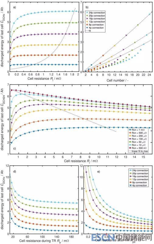以多并電池模組中最后一個(gè)電池放電容量為考察點(diǎn),圖9系統(tǒng)總結(jié)了新等效電路模型得到的各因素對(duì)模組熱擴(kuò)散過(guò)程的影響結(jié)果。對(duì)比各因素的影響不難看出,Rptr值對(duì)電池放電容量的影響最大(圖9e),尤其是并聯(lián)電池?cái)?shù)量增加、Rptr值減小的情形下。如上所述,Rptr值會(huì)受模組約束狀態(tài)的影響,因此控制模組的約束狀態(tài)對(duì)熱擴(kuò)散結(jié)果有顯著影響。此外,從結(jié)果看共24個(gè)電池的多并模組熱擴(kuò)散過(guò)程最后一個(gè)電池的放電量CDCH≈6-10 Ah。結(jié)合圖1和圖2結(jié)果顯示30%SOC以下電池更為安全,不難想到如果多并模組中電池單體總?cè)萘緾cell≈10–15 Ah,就可以確保放電后電池SOC低于30%,從而降低電池?zé)崾Э孛土页潭壬踔磷柚篃釘U(kuò)散的發(fā)生。因此,在這個(gè)意義上講,小容量電池多并較大容量電池少并更為安全。