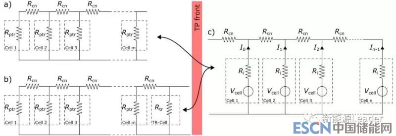 圖8. 刨除測(cè)量設(shè)備影響后的等效電路模型:(a)電池?zé)崾Э亟Y(jié)束后部分,其中沒(méi)有電池處在熱失控階段;(b)電池?zé)崾Э亟Y(jié)束部分,但其中有一電池處在熱失控階段;(c)未發(fā)生熱失控的健康電池部分。