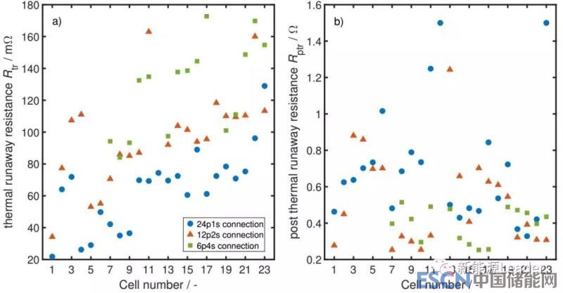 等效電路模型模擬結(jié)果顯示,Rtr值在20-180 m?范圍變化,均值為92 m?。從圖7a可以觀察到后發(fā)生熱失控電池的Rtr值呈不斷增大趨勢(shì),作者認(rèn)為這是熱失控導(dǎo)致模組中的約束變?nèi)?、電池膨脹增大所致。Rptr值在0.2-1.5 ?范圍變化,均值為0.54 ?,但數(shù)據(jù)點(diǎn)極為范圍沒(méi)有顯著規(guī)律。