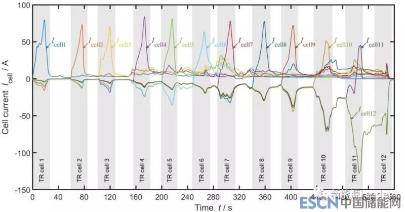 圖4.針刺觸發(fā)12P2S模組熱擴(kuò)散過(guò)程電流值變化。其中電流為正值表示該電池在充電,負(fù)值表示該電池在放電。圖中的灰色區(qū)域表示單個(gè)電池的可見(jiàn)熱失控過(guò)程。