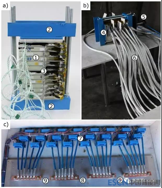 圖3. 針刺觸發(fā)多并電池?zé)釘U(kuò)散實(shí)驗(yàn)裝置圖。圖中1為模組中的電芯,2為夾具,3為busbar,4為完整模組,5為針刺觸發(fā)器,6-9為連接線。