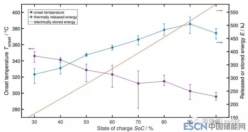 圖1. 電池不同SOC下加熱觸發(fā)熱失控溫度及能量釋放。