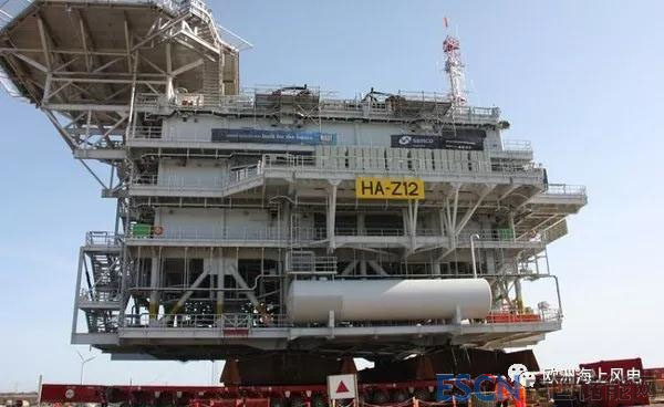 由于離岸較遠,輸電損耗很大,還存在過電壓,沃旭能源在詳細評估之后,最終采用了3座海上升壓站+1座海上無功補償站的方案。無功補償站建在離岸約60km處,其中上部結(jié)構(gòu)總重2100噸,采用導(dǎo)管架基礎(chǔ),基礎(chǔ)總重1400噸。