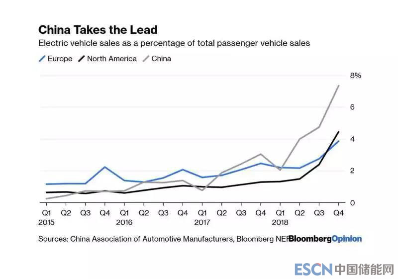 2018年新能源汽車在中國銷售的2810萬輛汽車中僅占4%,但這個比率高于美國(低于2%)和歐洲(略超3%)。自2015年以來,中國電動汽車銷量一直超過美國,而且差距在拉大。2018年中國電動汽車銷量已經(jīng)是美國的三倍,預計2019年中國新能源汽車銷量可達160萬輛。