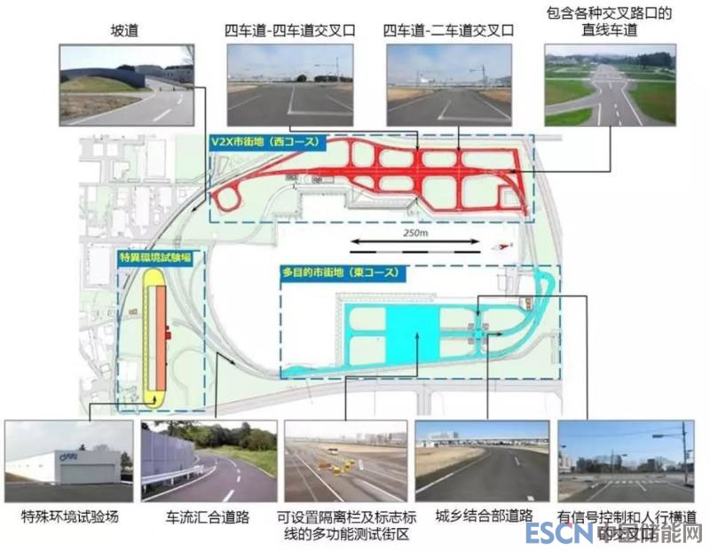 隨著整備項(xiàng)目的推動(dòng),自動(dòng)駕駛汽車測(cè)試場(chǎng) J-town 于 2017 年 4 月面向日本國(guó)內(nèi)企業(yè)和研究機(jī)構(gòu)開(kāi)放測(cè)試。該測(cè)試場(chǎng)占地約 240 畝,具有特殊環(huán)境測(cè)試區(qū)域、 V2X 測(cè)試區(qū)域和多功能測(cè)試區(qū)域 3 片測(cè)試區(qū)域,能夠提供包含各種交叉路口的直線車道、四車道-二車道交叉口、四車道-四車道交叉口、坡道、城鄉(xiāng)結(jié)合部道路、有信號(hào)控制和人行橫道的交叉口、可設(shè)置隔離欄及標(biāo)志標(biāo)線的多功能測(cè)試街區(qū)、車流匯合道路等多種測(cè)試場(chǎng)景。