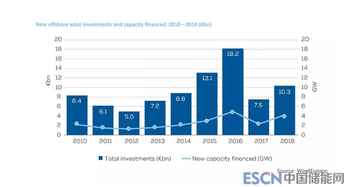 另外還有12個(gè)新的海上風(fēng)電項(xiàng)目于2018年達(dá)成最終投資決策,這意味著產(chǎn)能將進(jìn)一步增加4.2吉瓦,投資額將達(dá)到103億歐元。2018年的海上風(fēng)電投資數(shù)據(jù)同樣增長(zhǎng),較之2017年的水平增長(zhǎng)了37%,但促進(jìn)產(chǎn)能增加的資金增長(zhǎng)了86%,這表明成本下降的速度和每單元投資可以產(chǎn)生的容量。