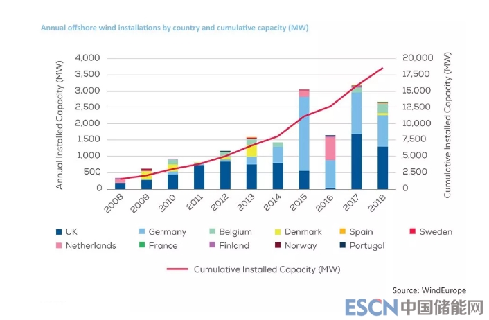 報(bào)告顯示,2018年共有15個(gè)新的海上風(fēng)電場(chǎng)上線,英國(guó)和德國(guó)合計(jì)占去年新增產(chǎn)能的85%,分別為1.3吉瓦和969兆瓦。截止2018年,歐洲海上風(fēng)電總產(chǎn)能增加了18%,該地區(qū)現(xiàn)有105個(gè)海上風(fēng)電場(chǎng),分布在11個(gè)國(guó)家,總?cè)萘繛?8.5吉瓦。
