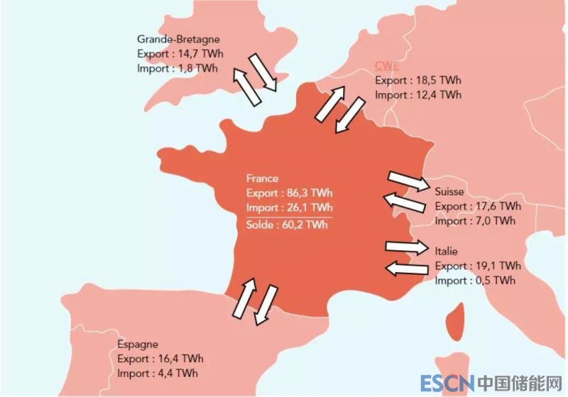 中國(guó)儲(chǔ)能網(wǎng)訊:根據(jù)法國(guó)國(guó)家電網(wǎng)RTE最新發(fā)布的統(tǒng)計(jì)數(shù)據(jù),2018年法國(guó)電力出口86.3TWh(863億千瓦時(shí)),進(jìn)口26.1TWh,凈出口60.2TWh。相對(duì)于法國(guó)的主要鄰國(guó),以核電為主(發(fā)電量占71.6%)的法國(guó)均為凈出口國(guó)。