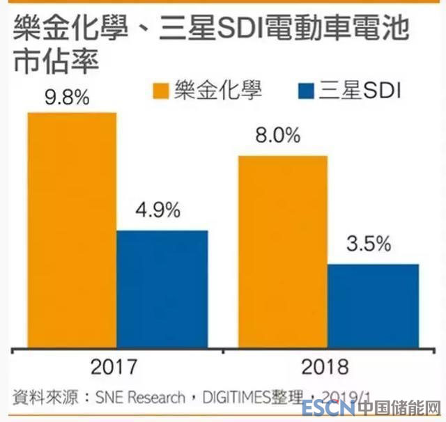 韓媒DigitalTimes引述市調(diào)機(jī)構(gòu)SNE Research最新公布的資料,指出如以2018年11月底為基準(zhǔn),2018年全球電動(dòng)汽車電池出貨量排名,樂金化學(xué)、三星SDI市占率分別為8.0%及3.5%,相較2017年同期的9.8%與4.9%,分別減少1.8個(gè)及1.4個(gè)百分點(diǎn)。