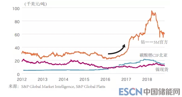 自2016年以來,在倫敦金屬交易所(LME)交易的鈷價(jià)已翻了兩番多,在2018年3月達(dá)到9.55萬美元/噸的峰值。同樣地,碳酸鋰價(jià)格自2016年以來已翻了一番多,但近期一直在下滑。自5月4日S&P Global Platts推出電池級(jí)碳酸鋰估價(jià)以來,海運(yùn)市場價(jià)格已大幅下滑,遠(yuǎn)低于最初估報(bào)的1.8萬美元/噸水平。