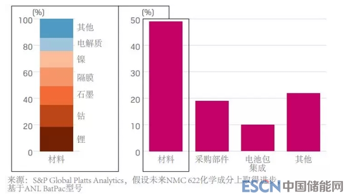 材料目前在電池總成本中占近50%,其中鈷、鋰、鎳和石墨最為昂貴,占總成本的30%。在其他方面不變的情況下,工藝和化學(xué)成分改良及電池包工程技術(shù)進(jìn)步將降低電池價(jià)格。反過來,電池成本的金屬價(jià)格風(fēng)險(xiǎn)將增加,因?yàn)檫@些關(guān)鍵原材料在電池價(jià)格中占較大比重。