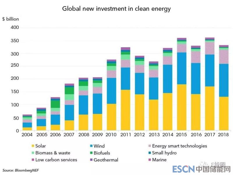 中國儲能網(wǎng)訊:彭博新能源財(cái)經(jīng)(BNEF)周三公布了其年度和權(quán)威的全球清潔能源投資數(shù)據(jù),顯示2018年的總投資達(dá)到了令人印象深刻的3331億美元,盡管這比2017年的3617億美元下降了7%,但這是清潔能源投資連續(xù)第五年超過3000億美元。
