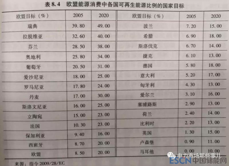 各國(guó)可再生能源比例分解目標(biāo)為[5]: