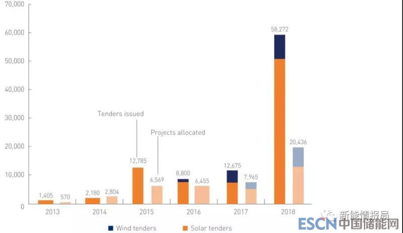 Mercom匯總的2018年印度部分大型光伏招標(biāo)信息如下: