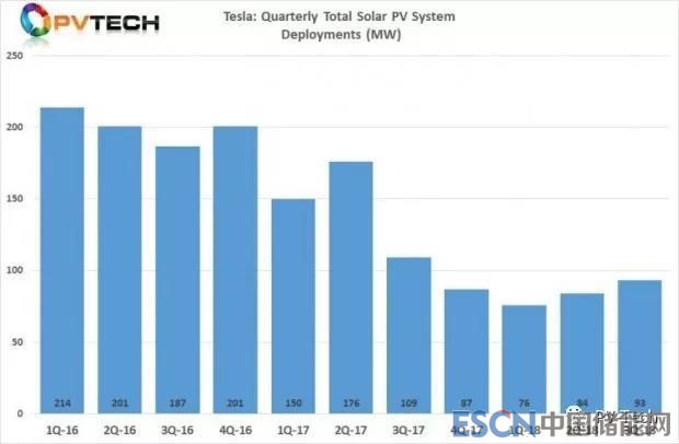 2018年三季度,特斯拉太陽能項目裝機總量為 93MW, 高于上一季度(84MW),這是自2017年四季度以來的最佳數(shù)值, 但仍低于上年同期水平 (107MW)。