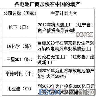 此前,全球最大的車載電池制造商寧德時代新能源科技(CATL)計劃2020年之前將車載電池的產能提高至2017年的4倍以上,達到50GWh。比亞迪(BYD)將在2020年之前投入超過3000億日元,將年產能提高至60GWh。而日本的松下最早將在2019年內將車載電池的產能最大提高8成。韓國的LG化學也將于2020年在南京新建工廠。
