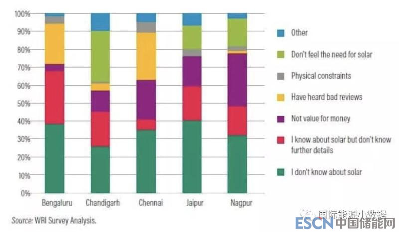 調(diào)查結(jié)果表明,未安裝屋頂太陽能光伏發(fā)電的家庭的認(rèn)知水平非常低。根據(jù)該報(bào)告,在接受調(diào)查的五個(gè)城市中,大約53%的未考慮太陽能光伏的消費(fèi)者或者是因?yàn)樗麄儾涣私馓柲?,或者不了解足夠的?xì)節(jié)來考慮太陽能。多達(dá)70%的計(jì)劃安裝屋頂太陽能電池板的家庭并不知道太陽能熱水器和太陽能屋頂光伏用于發(fā)電的區(qū)別。另外一個(gè)問題是信息缺失。研究結(jié)果表明,即使是那些懂得太陽能光伏知識(shí)的居民和渴望獲得綠色能源的人,也會(huì)因?yàn)閷τ诠┴浬虄r(jià)格信息的不信任但又沒有其他可靠的信息源而選擇放棄。只有19%的被調(diào)查家庭在互聯(lián)網(wǎng)上查詢屋頂太陽能光伏裝置的信息。此外,潛在用戶缺乏對安裝過程的了解、審批流程的繁雜、融資選擇不足以及政府機(jī)構(gòu)之間協(xié)調(diào)的問題,這些都導(dǎo)致住宅屋頂太陽能光伏受挫。