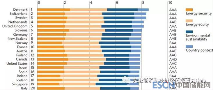 圖1 2018年“能源三難困境”指數(shù)綜合得分前20名的國(guó)家
