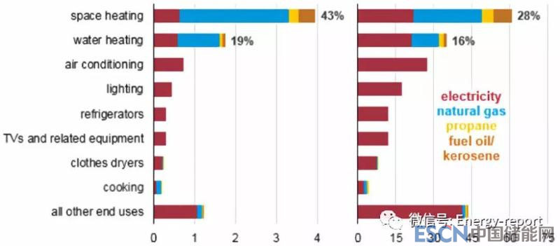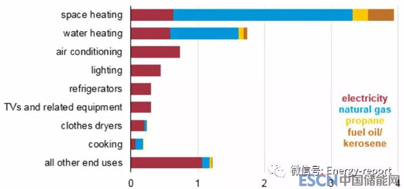 中國儲能網(wǎng)訊:最新的美國能源信息署住宅能耗調(diào)查(RECS)報告表明,在2015年美國家庭能源消費中,空間供暖和水供暖消耗的能量最高。空間供暖能源消耗主要受空間氣候條件和建筑特征的影響,而水供暖對應(yīng)的能源消耗則主要取決于家庭的人口數(shù)量。家庭使用不同的燃料進行空間供暖和水供暖,則會影響不同燃料在家庭終端能源消耗中的比重。