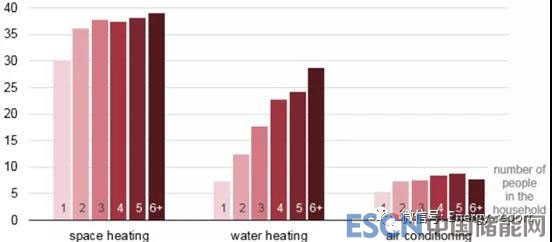 家庭成員的數(shù)量是家庭能源消耗的一個關(guān)鍵性因素,尤其是水供暖。2015年,一個兩人家庭的水供暖平均能消為12.5百萬英鎊熱值,占家庭總能耗的16%。而一個四人家庭水供暖的平均能耗近是兩人家庭的兩倍,達22.7百萬英鎊熱值,占家庭總能耗的24%。相比之下,家庭人口數(shù)對諸如空間供暖以及空調(diào)等其他終端能源用途的影響則相對較小。
