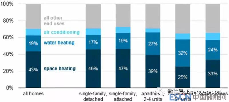 家庭能源消耗主要取決于房屋結(jié)構(gòu)類型。2015年獨立式住宅占總居住房屋數(shù)量的62%,獨立式房屋的平均能耗水平是具有五個或五個以上居住單位公寓樓平均能耗的三倍多。截止到目前,獨立式住宅中的空間供暖占家庭總能源消耗的比例最大,高達46%。而大型居住公寓中的空間供暖僅占總能源消耗的25%。