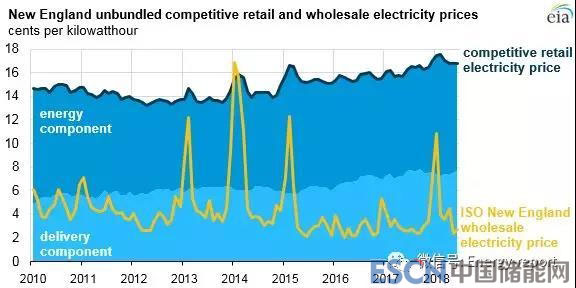 中國(guó)儲(chǔ)能網(wǎng)訊:在構(gòu)成新英格蘭的六個(gè)州中,除佛蒙特州外,其他所有州都放松了對(duì)電力市場(chǎng)的管制,允許用戶選擇有競(jìng)爭(zhēng)力的電力供應(yīng)商。由這類(選擇了有競(jìng)爭(zhēng)力的供應(yīng)商的)新英格蘭用戶支付的零售電價(jià)的波動(dòng)會(huì)比批發(fā)電價(jià)小得多,但競(jìng)爭(zhēng)性零售電價(jià)的短時(shí)增長(zhǎng)與批發(fā)電價(jià)的最大漲幅幾乎同時(shí)發(fā)生。