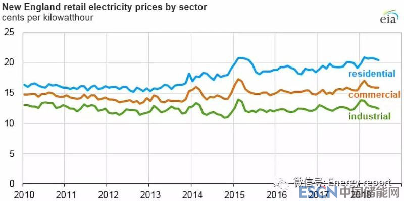 該地區(qū)的住宅電價(jià)高于商業(yè)和工業(yè)部門的電價(jià)。2015年之前,新英格蘭的競(jìng)爭(zhēng)性零售住宅用電價(jià)格相對(duì)穩(wěn)定。然而,在當(dāng)年的1月份,新英格蘭競(jìng)爭(zhēng)性零售住宅用電價(jià)格的能源生成部分的比重增加了近20%,以彌補(bǔ)前兩個(gè)冬季的價(jià)格上漲。在批發(fā)電價(jià)高波動(dòng)的時(shí)候,工業(yè)和商業(yè)部門的競(jìng)爭(zhēng)性零售價(jià)格通常會(huì)更快回應(yīng),因?yàn)檫@些行業(yè)的用戶經(jīng)常簽訂可變價(jià)格合約,而合約中買方所簽訂的價(jià)格更貼合批發(fā)市場(chǎng)的變化走勢(shì)。