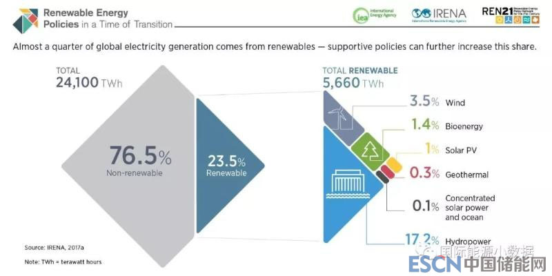 中國儲能網(wǎng)訊:根據(jù)國際可再生能源署(IRENA)的數(shù)據(jù),2017年全球發(fā)電量24萬億千瓦時,其中23.5%來自可再生能源電源(5.66萬億千瓦時)。