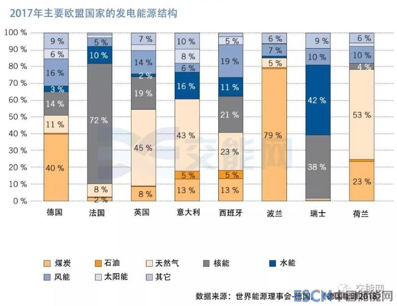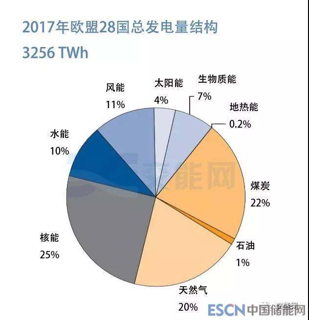 歐盟28國成員國的發(fā)電結(jié)構(gòu)差異很大,這是由各國不同能源種類的不同供應(yīng)能力(國內(nèi)儲量或進口的可能性)以及各國政府過去幾十年的能源政策決定的。
