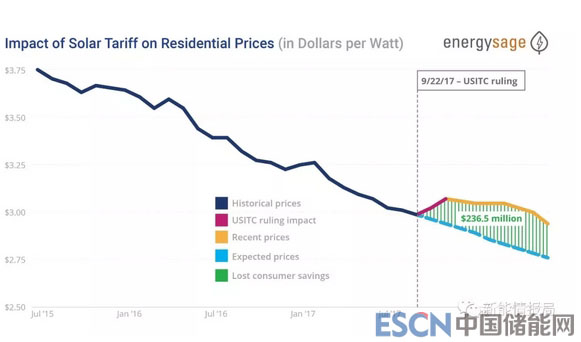 2017年9月后的全美范圍內(nèi)的光伏產(chǎn)品價(jià)格上漲,關(guān)稅實(shí)際上給美國消費(fèi)者帶來了2.365億美元的稅收。