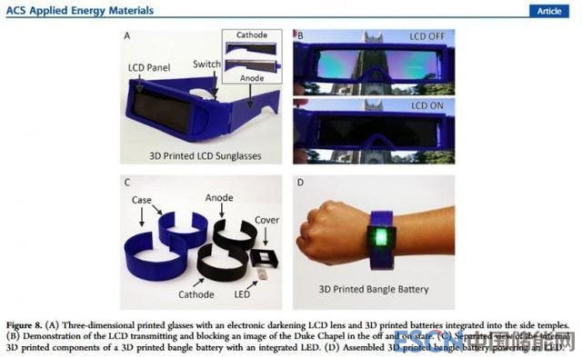 為了展示3D打印電池的未來潛力,該團隊使用該技術打印出了集成鋰離子電池的LED手鐲,內置電池可以為LED燈持續(xù)照明60秒時間。雖然目前第一代3D打印電池的容量要比商用電池低兩個數(shù)量級,但是團隊表示已經找到了多種方案來增加容量,例如使用電導率更高的材料替代PLA等等。