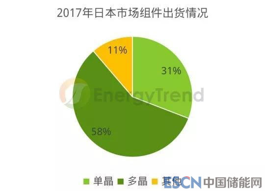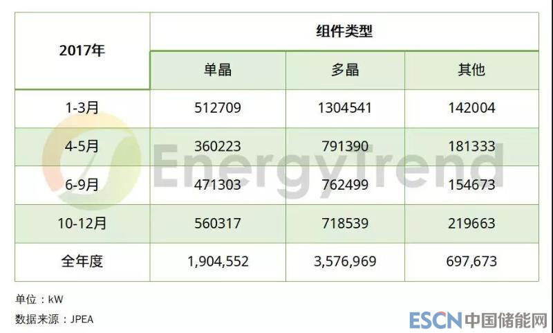 在2017年日本光伏組件出貨量中,JPEA季度數(shù)據(jù)顯示多晶組件出貨量為3.58GW,占比總出貨量的57.9%;單晶組件1.9GW,占比30.8%。