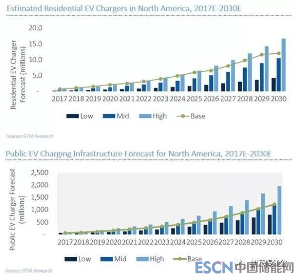 報告稱,到2030年僅在北美將安裝額外的1200萬個住宅充電點。與此同時,在歐洲市場,將有900萬個充電點安裝在私人家庭中。而公共充電基礎(chǔ)設(shè)施方面,GTM Research估計歐洲將安裝160萬個,而北美約為120萬個。