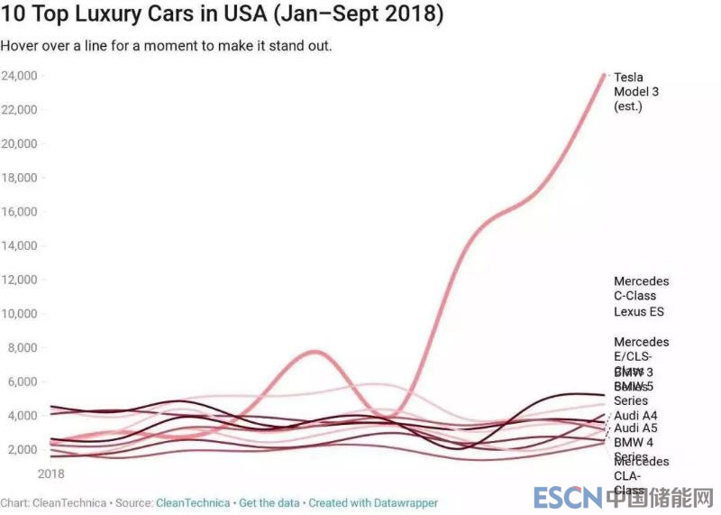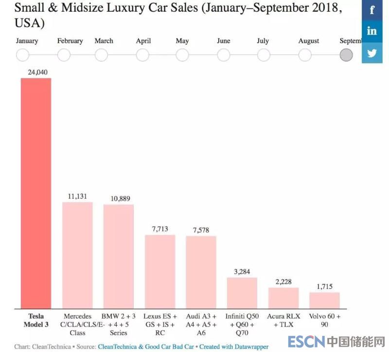 憑借Model 3一款車型,特斯拉更是將一眾豪華品牌打得落花流水。9月份,Model 3美國地區(qū)交付量達(dá)到22250輛,單款車型銷量超過了BMW 2 + 3 + 4 + 5系和奔馳C/CLA/CLS/E-Class銷量之和。