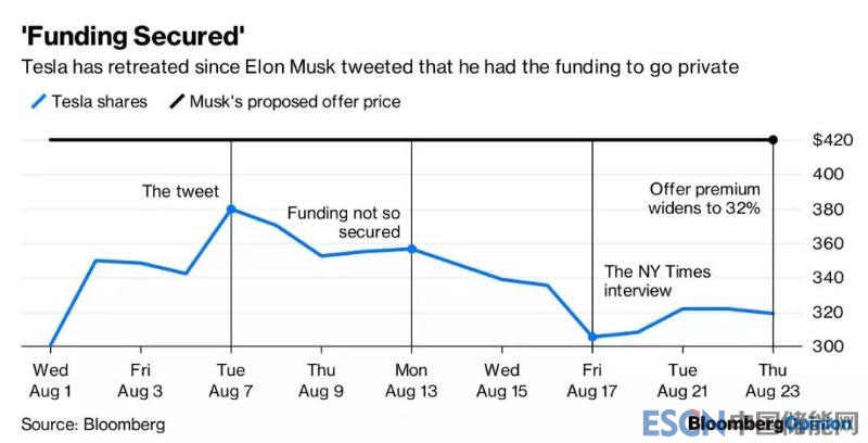 然而,任性的馬斯克總是不會讓事情平靜的發(fā)展下去。在Q2財報發(fā)布后不到一周,美國當(dāng)?shù)貢r間8月7日,馬斯克私自在Twitter發(fā)布消息稱:“我準(zhǔn)備以每股420美元的價格私有化特斯拉,資金已落實?!彪S后,馬斯克又在特斯拉官網(wǎng)上發(fā)表博客,詳細(xì)解釋了希望將特斯拉私有化的原因。特斯拉股票當(dāng)天大漲10.99%。