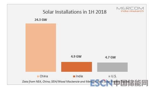 中國儲能網(wǎng)訊:2018年上半年(1H),印度是世界第二大太陽能市場,其以4.9吉瓦的新增產(chǎn)能超過美國的4.7吉瓦位居世界第二。全球第一大太陽能市場依然是中國,在2018年上半年增加了24.3吉瓦的太陽能光伏產(chǎn)能。