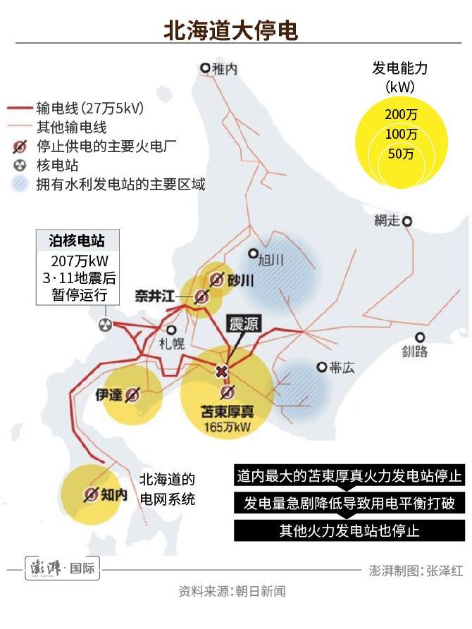 “能從本州得到的電力很少,北海道的電力系統(tǒng)基本上是獨(dú)立于本州的。另外發(fā)生地震時(shí)恰好是凌晨,是平時(shí)用電量最少的時(shí)間段,很多發(fā)電站沒有運(yùn)轉(zhuǎn),因此臨時(shí)無(wú)法確保電力輸出?!贝筅娓⒋髮W(xué)石龜篤司教授指出,此時(shí)供電量最大的苫東厚真發(fā)電站一旦停止,其他發(fā)電站要提高供電量需要運(yùn)轉(zhuǎn)的時(shí)間,電力供需失衡導(dǎo)致大規(guī)模停止運(yùn)轉(zhuǎn)。