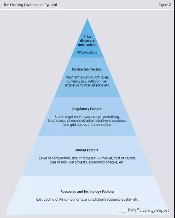 由于政策和市場因素的強(qiáng)力結(jié)合,包括豐富的可再生能源資源,像墨西哥、智利、阿聯(lián)酋等一些國家實(shí)現(xiàn)了大規(guī)模風(fēng)電和光伏項(xiàng)目的創(chuàng)紀(jì)錄低成本—0.02美元/千瓦時(shí)。報(bào)告將這些各種各樣的元素納入了合同、制度、市場和資源性因素的“金字塔”中,每個(gè)組成部分都對整體可再生能源項(xiàng)目成本的降低發(fā)揮了至關(guān)重要的作用。