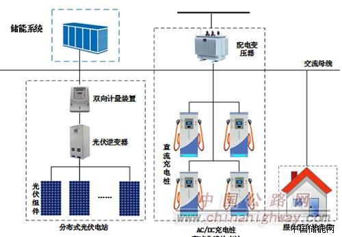 為了解決這一問題,同時為服務(wù)區(qū)和服務(wù)區(qū)充電站提供綠色電能,國家電網(wǎng)公司和招商局集團合作,利用徐官屯服務(wù)區(qū)屋頂和空地鋪設(shè)光伏發(fā)電裝置,共計安裝光伏設(shè)備292千瓦,安裝儲能設(shè)施228千瓦時,與已建成的電動汽車充電站形成光儲充一體化電站。該電站的光伏組件所發(fā)電能匯流后,經(jīng)逆變器、并網(wǎng)計量裝置,接入配電變壓器低壓側(cè)交流母線,可向服務(wù)區(qū)和充電站供電,剩余電力可經(jīng)配電變壓器上網(wǎng),實現(xiàn)“自發(fā)自用,余電上網(wǎng)”;同時,可利用電池建設(shè)一定比例的儲能設(shè)施。