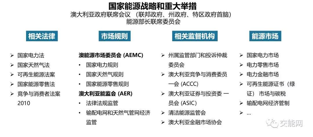 從上面的介紹就可以看出,澳大利亞的電力市場是一個強(qiáng)監(jiān)管市場。下圖具體展示了澳大利亞負(fù)責(zé)國家重點能源戰(zhàn)略和重大舉措的相關(guān)法律、規(guī)則、監(jiān)督機(jī)構(gòu)以及相關(guān)市場。
